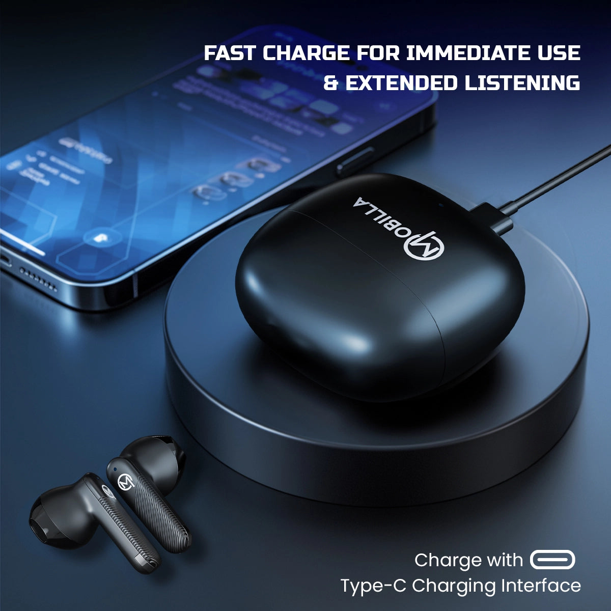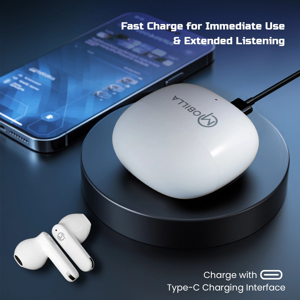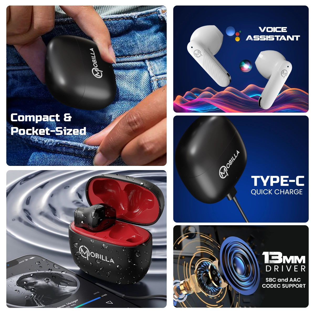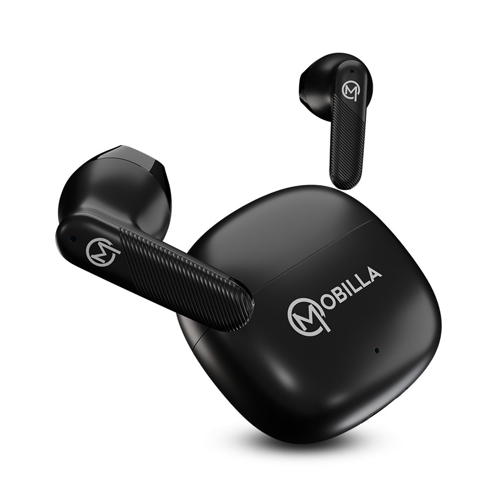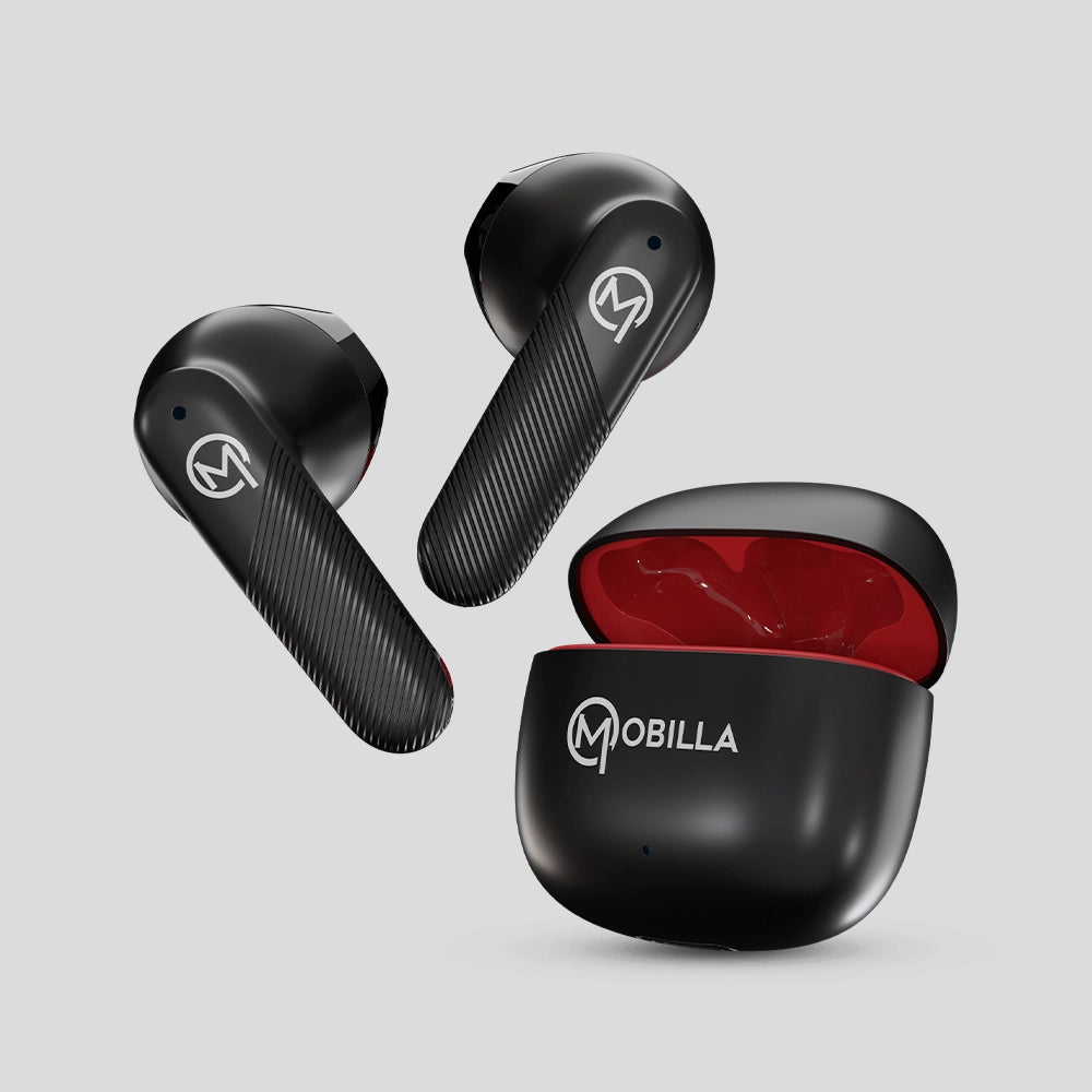Experience superior sound quality and convenience with Mobilla MBuds 106 – the perfect TWS earbuds for both calls and music. Whether you’re commuting, working out, or simply enjoying your favourite tracks, these half in-ear earbuds offer a seamless listening experience with up to 25 hours of music playtime. Featuring instant auto connect and Bluetooth V5.3, the MBuds 106 ensures a stable and fast wireless connection with a 10M wireless range for uninterrupted music and calls. The 13mm drivers deliver powerful, crystal-clear audio, while the environmental noise cancellation provides enhanced clarity for earbuds with good call quality. Designed for comfort and convenience, the MBuds 106 are IPX4 sweat-resistant, making them ideal for workouts or any weather condition. With fast charging and a Type-C charging port, a quick charge will get you back to your playlist in no time. Available in black-red and white-grey, choose the colour that suits your style best. Looking for the best earbuds for calls and music? The Mobilla MBuds 106 ticks all the boxes. Buy these earbuds online and enjoy the ultimate combination of style, comfort, and performance with these fast-charging earbuds – your true wireless companion for every moment!