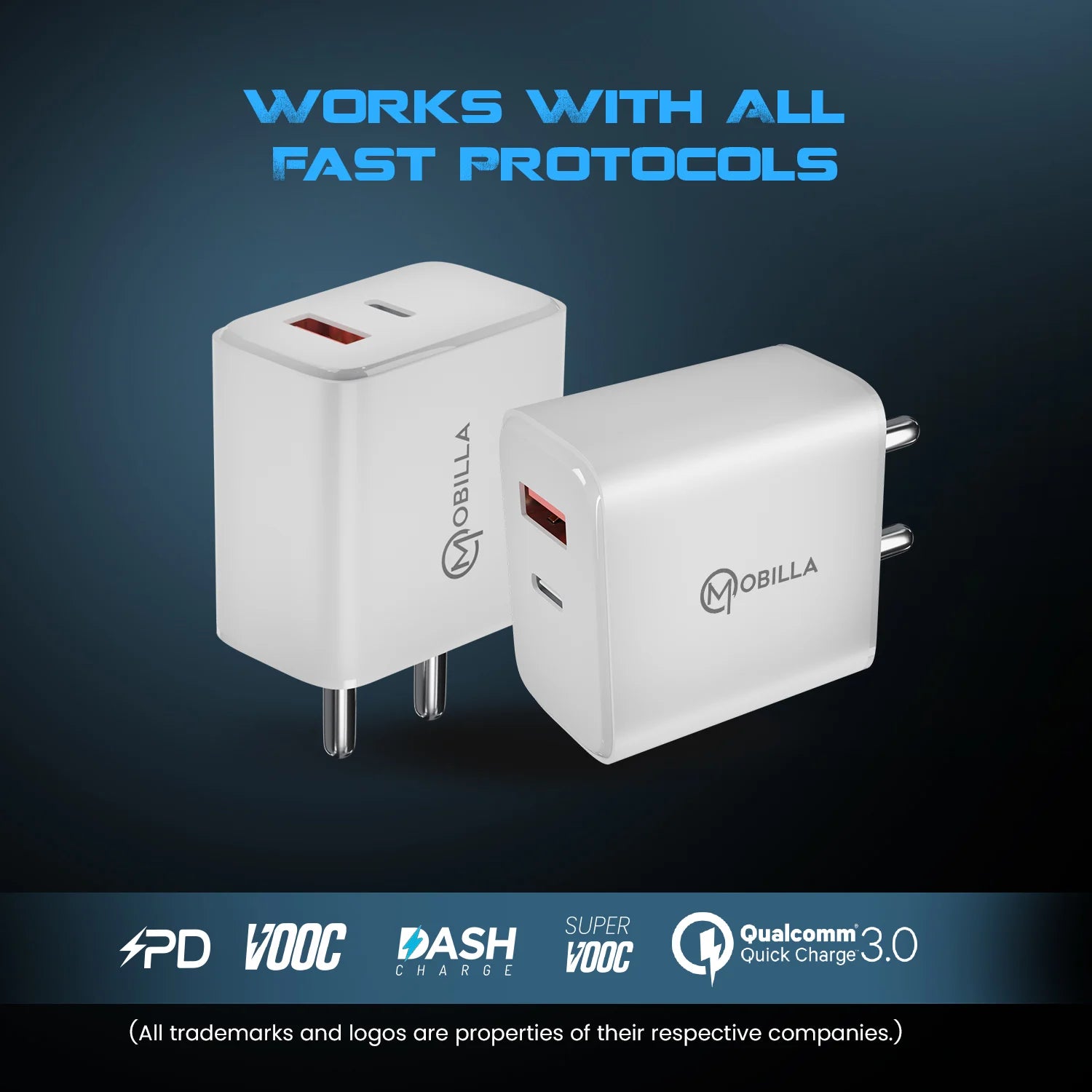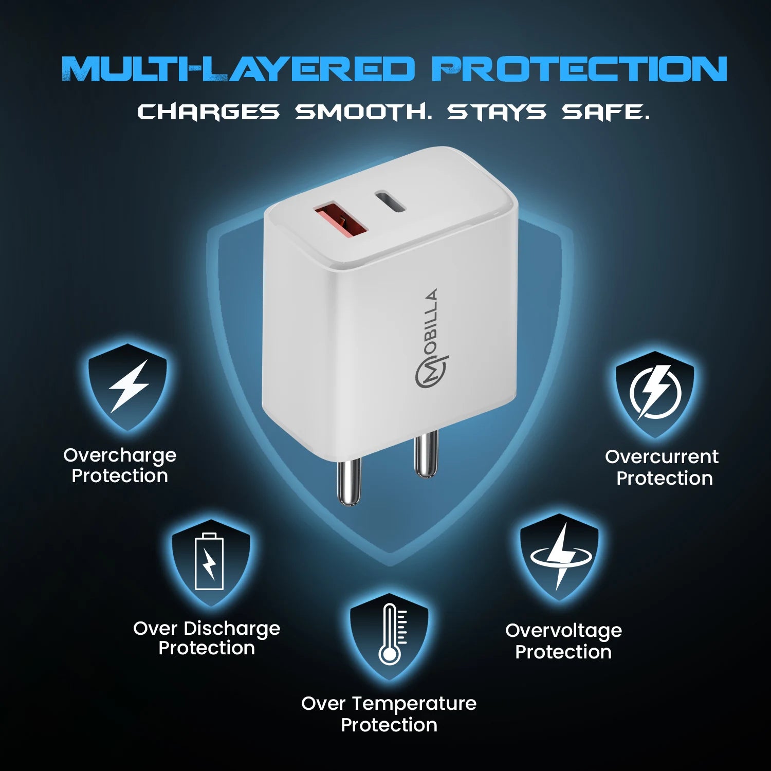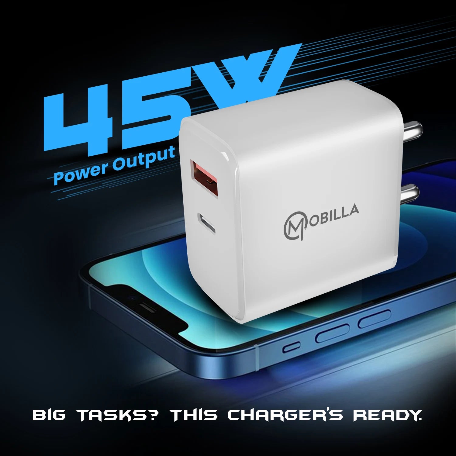 The MCharge 745 brings together powerful performance and travel-ready design in one sleek package. With a 45W charger output and support for PD+QC 3.0 protocols, it powers phones, tablets, and even laptops with ease making it a truly laptop compatible charger. This universal fast charger features dual charging ports, so you can charge two devices simultaneously without sacrificing speed. Built with highly efficient circuits and multi-layered protection, it's engineered to be as safe as it is fast. Whether you need a reliable phone charger, a compact travel charger, or a versatile travel adapter, this lightweight travel charger has you covered. Its compact and lightweight form factor fits effortlessly into your bag, making it the best charger to take on every journey. Smart, secure, and stylish, the MCharge 745 redefines what a high-performance charger should be—simple, powerful, and travel-friendly.