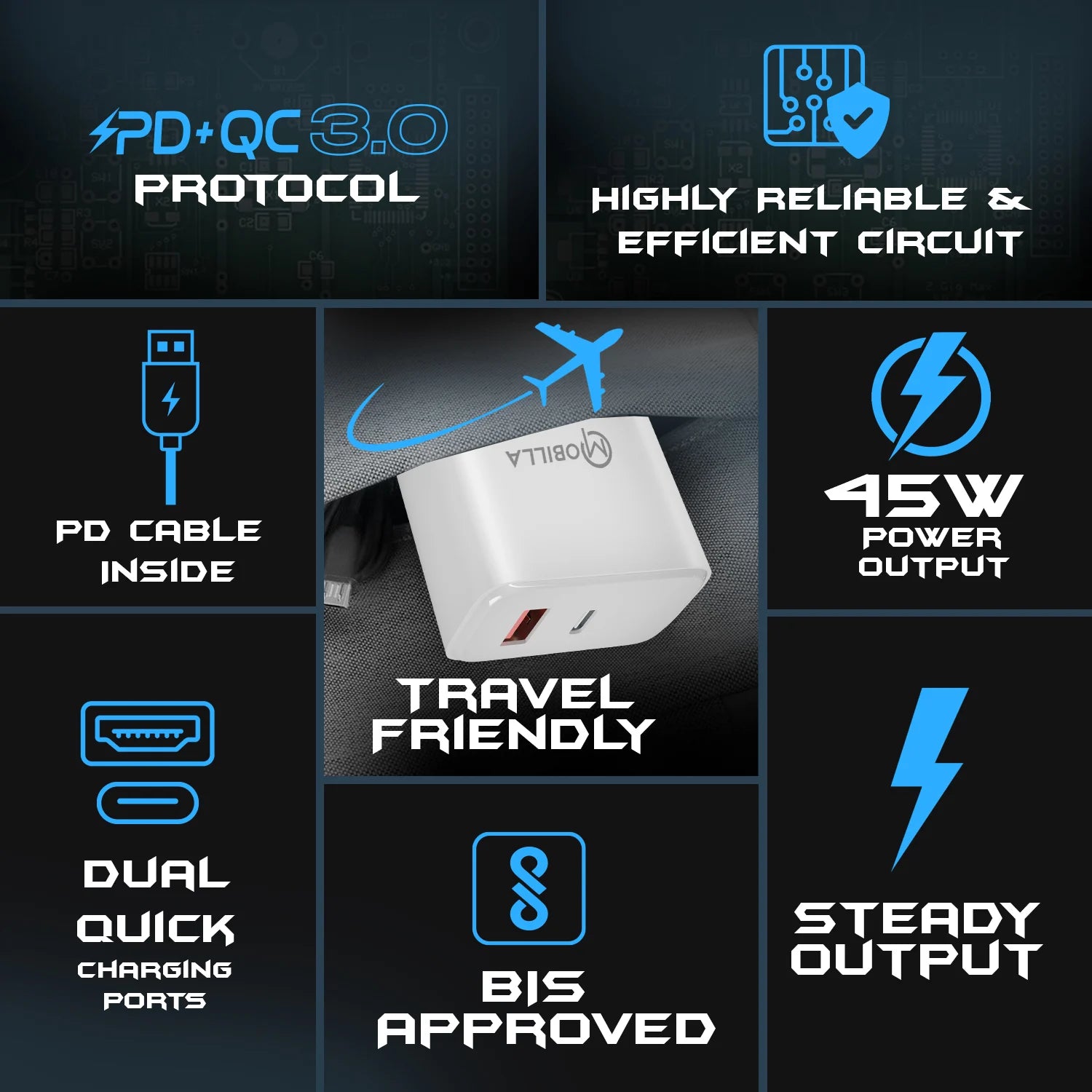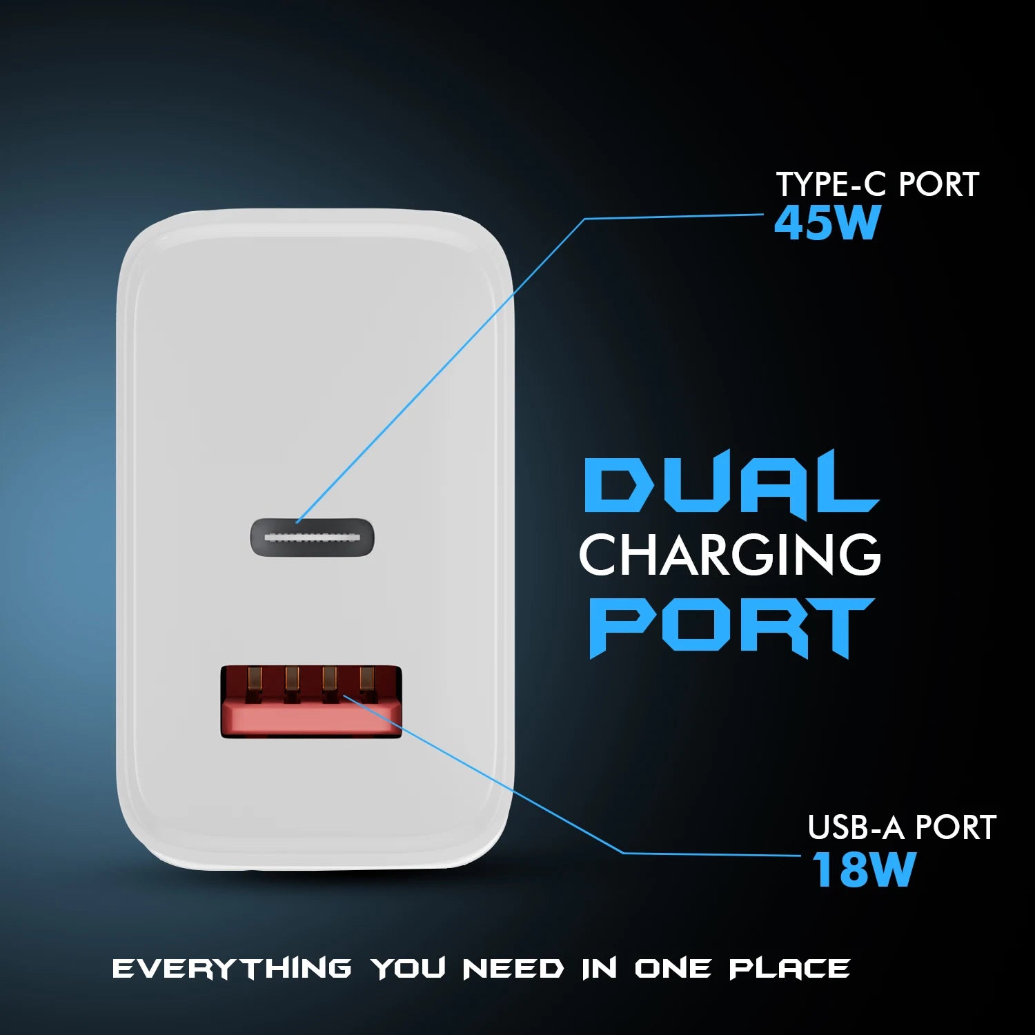 45W Power Output | PD+QC 3.0 Protocol | Supports Laptop Charging | Wide Compatibility | Dual Charging Ports | Highly Reliable & Efficient Circuits | Multi-Layered Protection | Compact & Lightweight