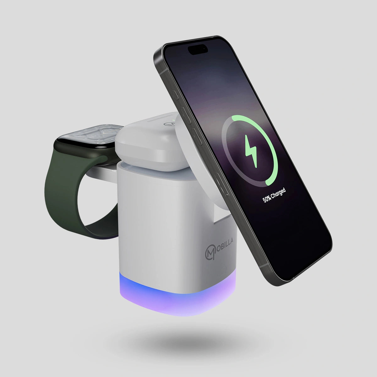 Experience the future of effortless charging with the MCharge Volt, the ultimate wireless charger designed for seamless power delivery. This 3-in-1 wireless charger supports MagSafe charging, ensuring a strong magnetic hold for a secure and stable connection. With 23W wireless charging and a 15W wireless output, power up your devices quickly and efficiently. The sleek and compact design makes it a perfect portable mobile charger, while the 2 RGB light modes add a stylish touch to your workspace or nightstand. Whether you're looking for the best wireless charger for your iPhone, smartwatch, or other Qi-enabled devices, the MCharge Volt delivers reliable and fast wireless charging with ease. Upgrade to smarter, clutter-free charging by induction today!