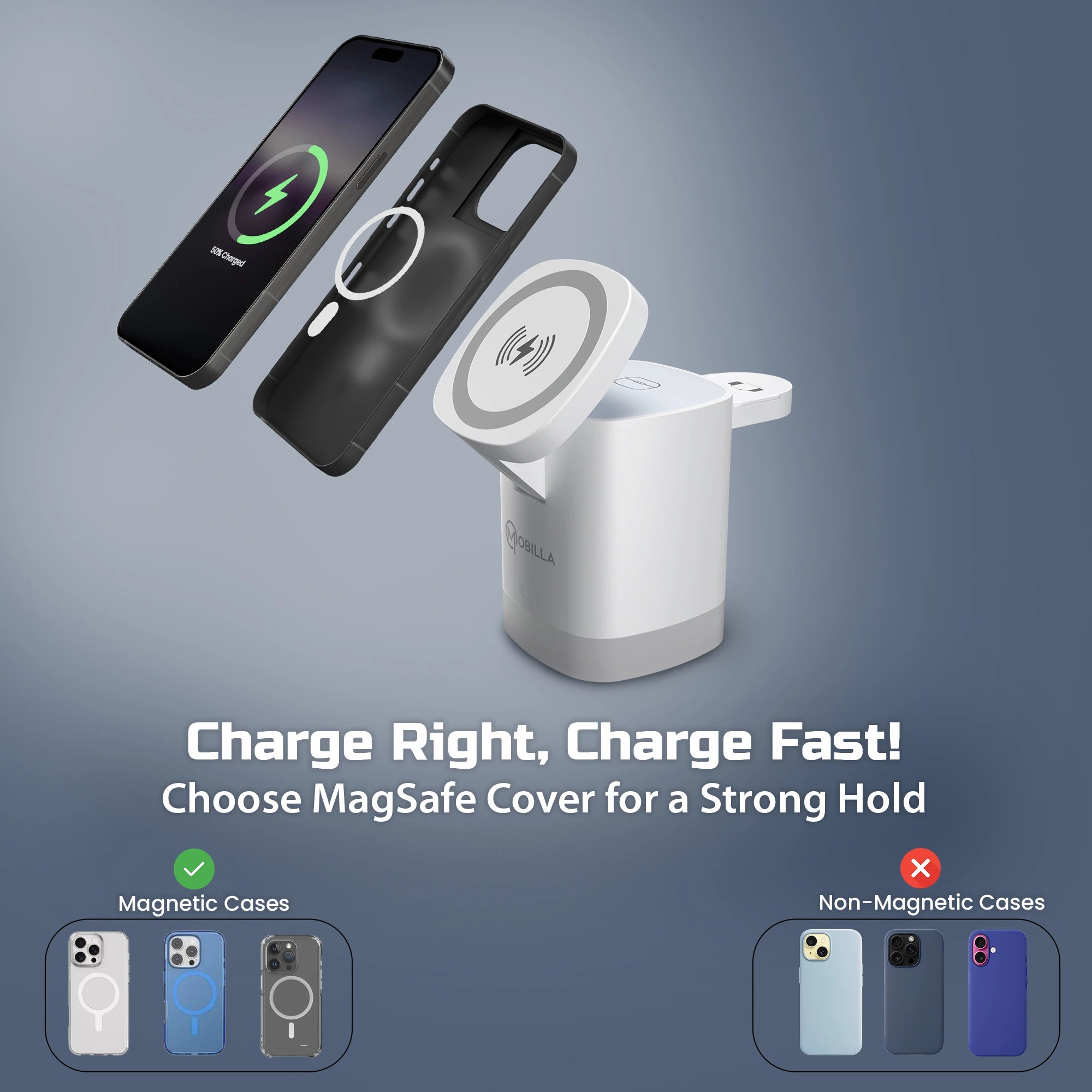 MCharge Volt is designed to simplify your routine. With fast wireless charging and a stand-style design, it powers your essentials while keeping your desk neat and clutter-free.
