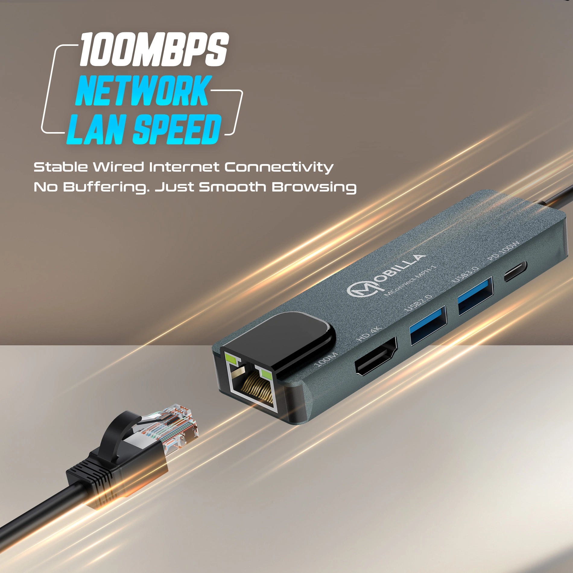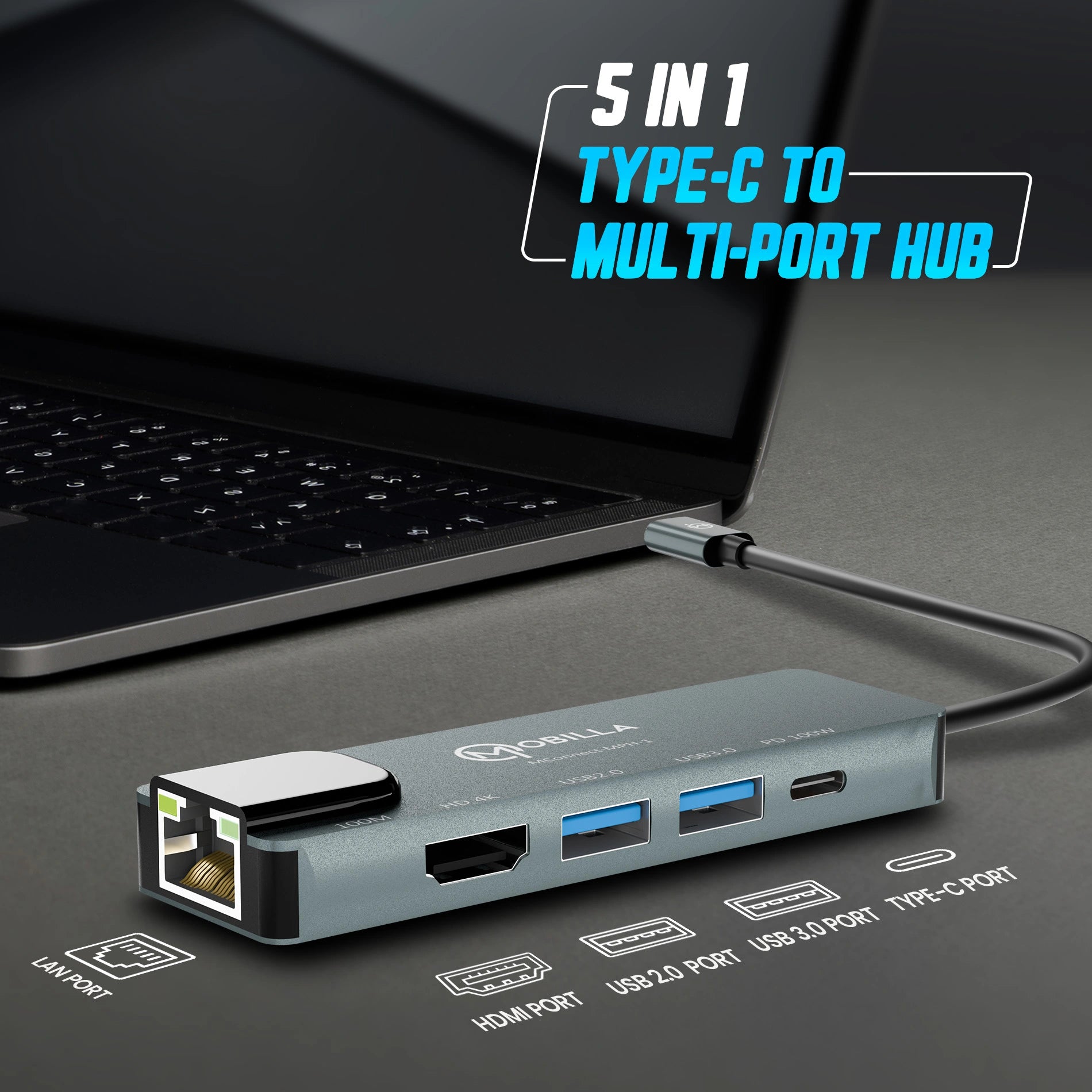 5 in 1 Type-C To Multi-Port Hub | 100mbps Network LAN Speed | 4K @30Hz HDMI Port | Plug & Play | Aluminium Alloy Casing | 100W USB-C PD Charging Port | USB 3.0 Port | USB 2.0 Port | Wide Compatibility | Smart Cooling Design | Sleek Aluminium Body | Anti-Strain Design Cable | Compact & Lightweight