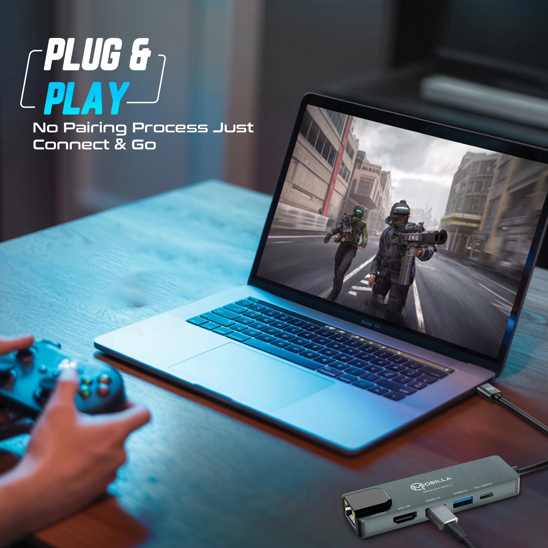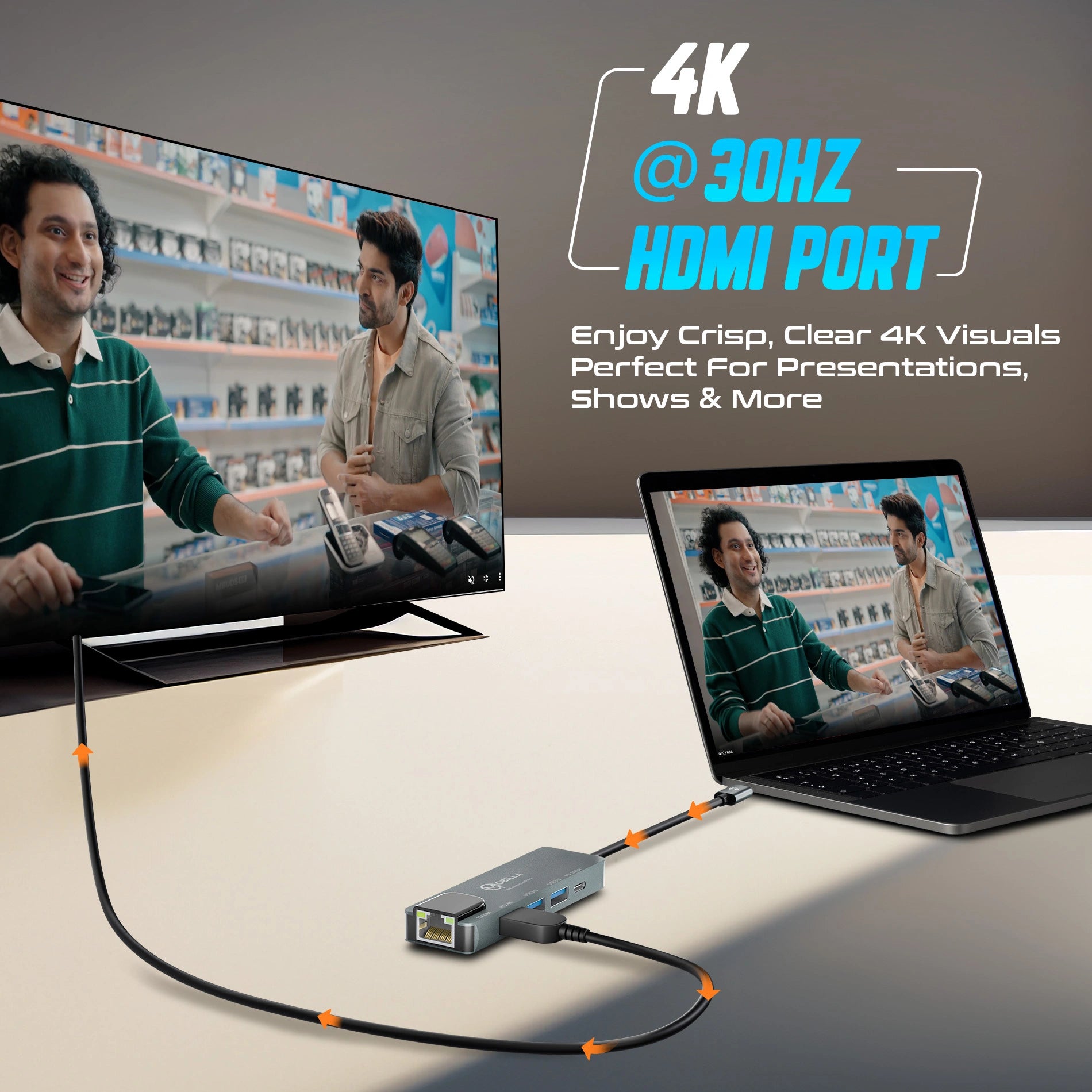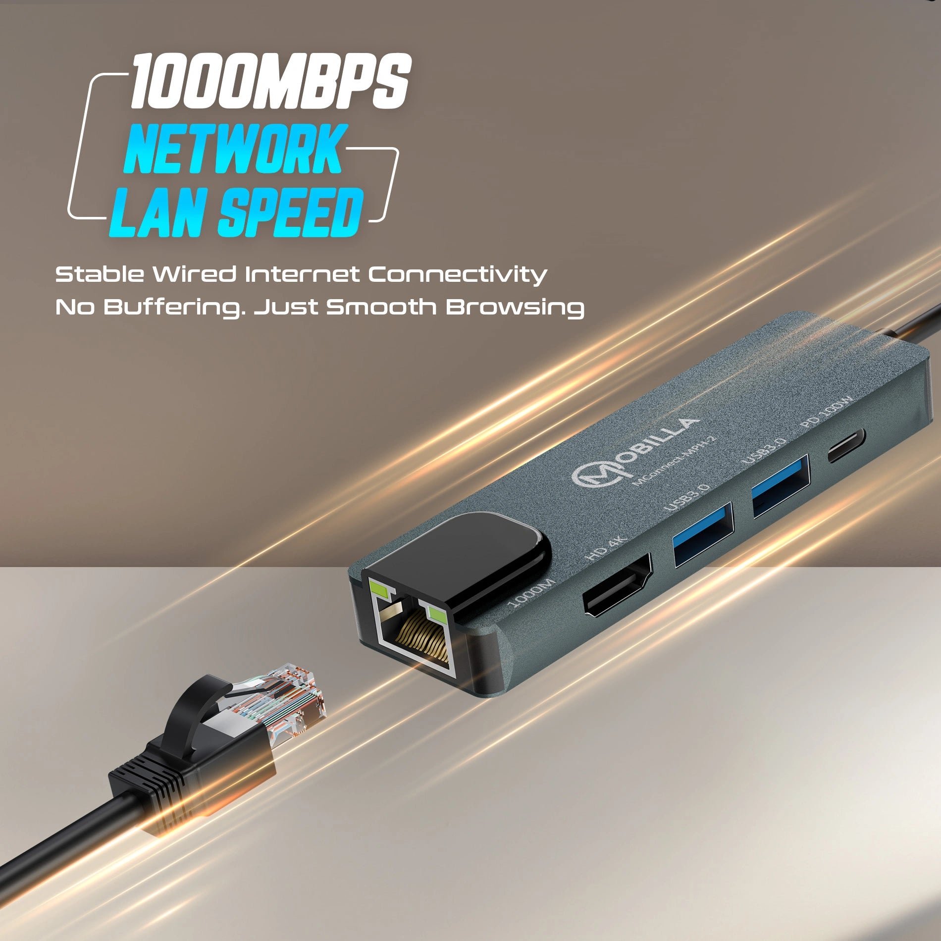 5 in 1 Type-C To Multi-Port Hub | 1000mbps Network LAN Speed | 4K @30Hz HDMI Port | Plug & Play | Aluminium Alloy Casing | 100W USB-C PD Charging Port | USB 3.0 Port | USB 2.0 Port | Wide Compatibility | Smart Cooling Design | Sleek Aluminium Body | Anti-Strain Design Cable | Compact & Lightweight