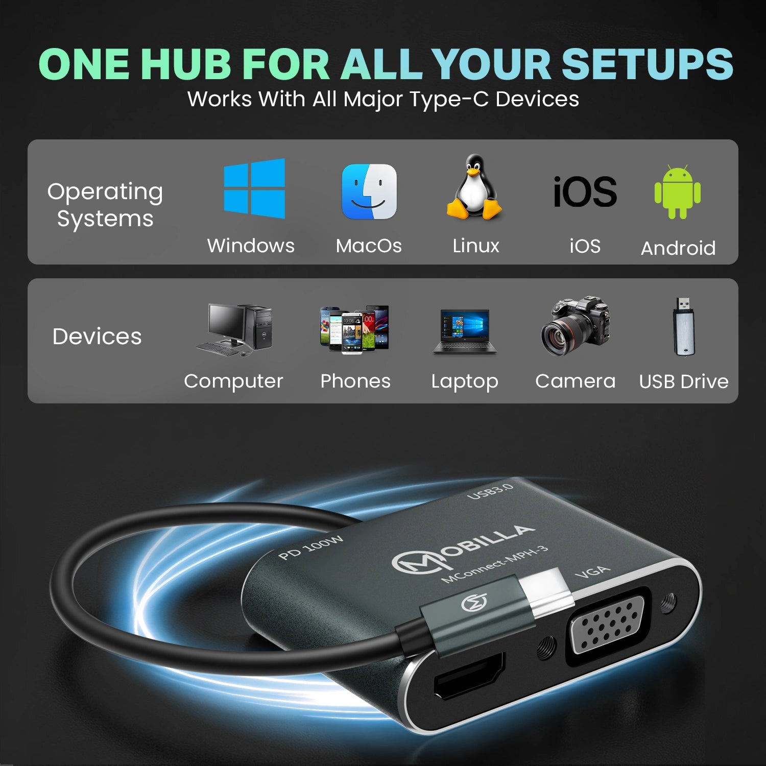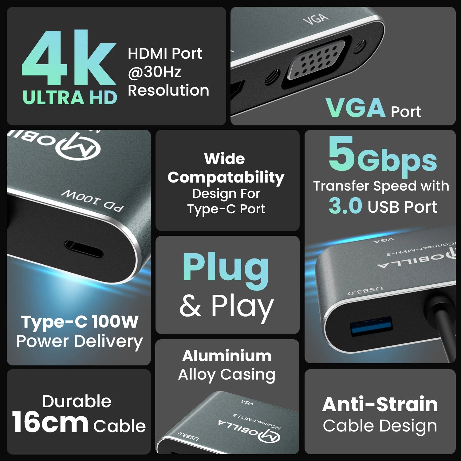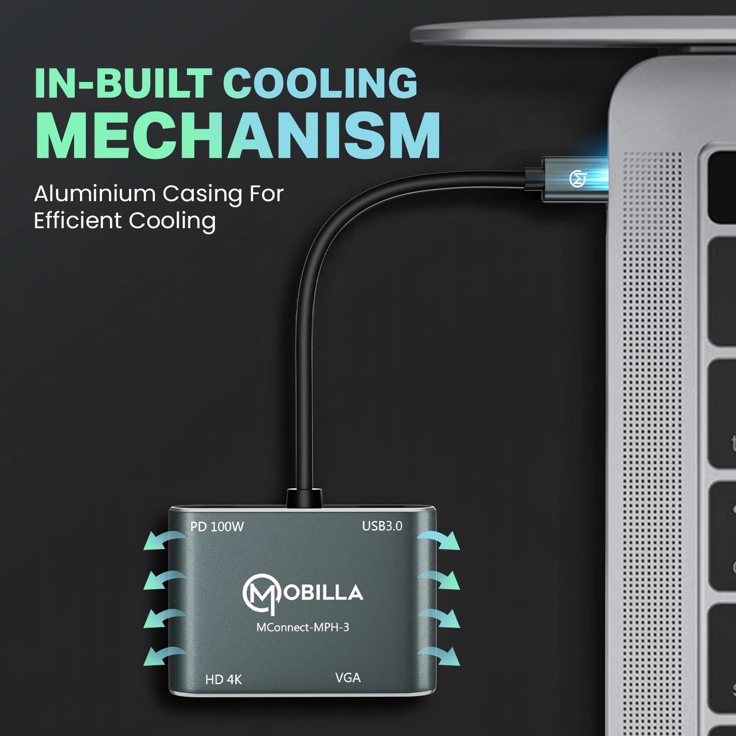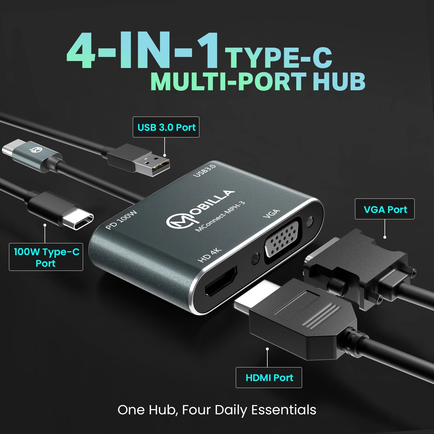 MConnect MPH3 is a powerful and elegant 4 in 1 type c hub, designed to simplify your workspace while maximizing functionality. With a 100W PD charger, USB 3.0, VGA port, and 4K @30Hz HDMI output, it brings seamless connectivity to laptops, tablets, and smartphones. Built for performance and portability, this USB-C hub features a sleek aluminium body, smart cooling design, and anti-strain cable to ensure long-lasting durability. It’s fully plug & play—no drivers, no fuss. Ideal for professionals and creatives alike, this USB adapter doubles as a type-C to HDMI adapter, multiple USB connector, and type C to USB converter in one compact device. Whether you're setting up for a presentation or powering through work on the go, it’s the USB hub, port hub, and all-around productivity booster you didn’t know you needed. For anyone who demands performance in a sleek package, this is the 4 in 1 multi port hub to trust.