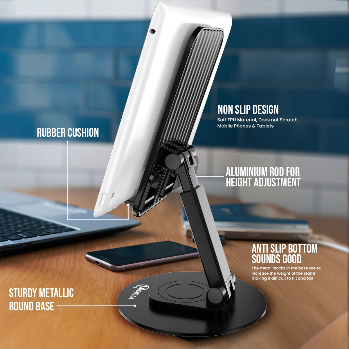 Mobile & Tablet Stand | 360 Degree Solid Rotation | Ultra Stable Heavy Duty Metal Base | Adjustable Height & Viewing Angle | Anti-Skid Design | Fully Rubber Cushion | Aluminium Alloy Arm