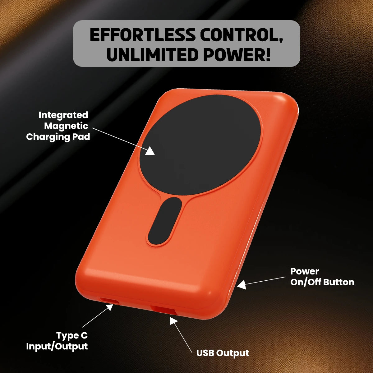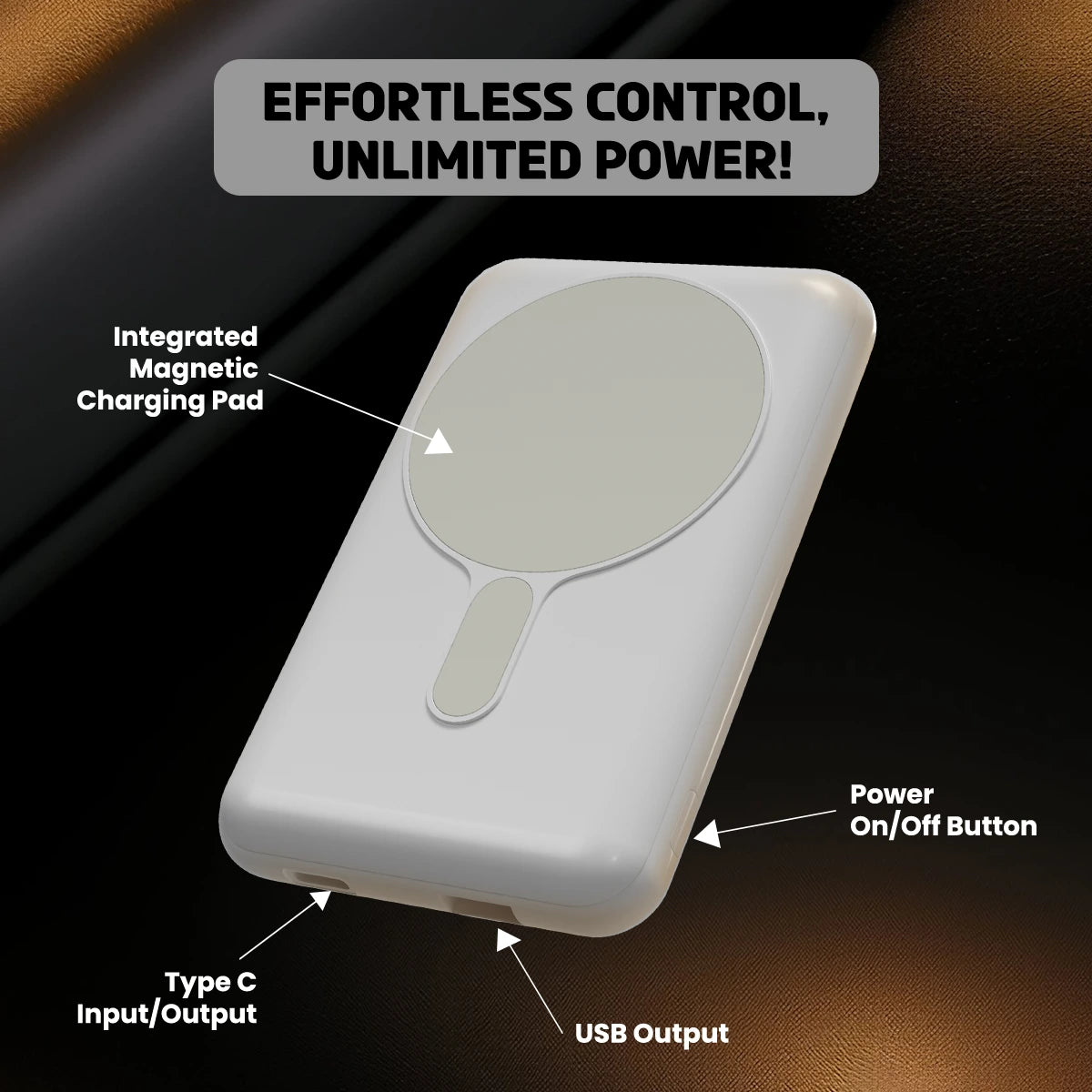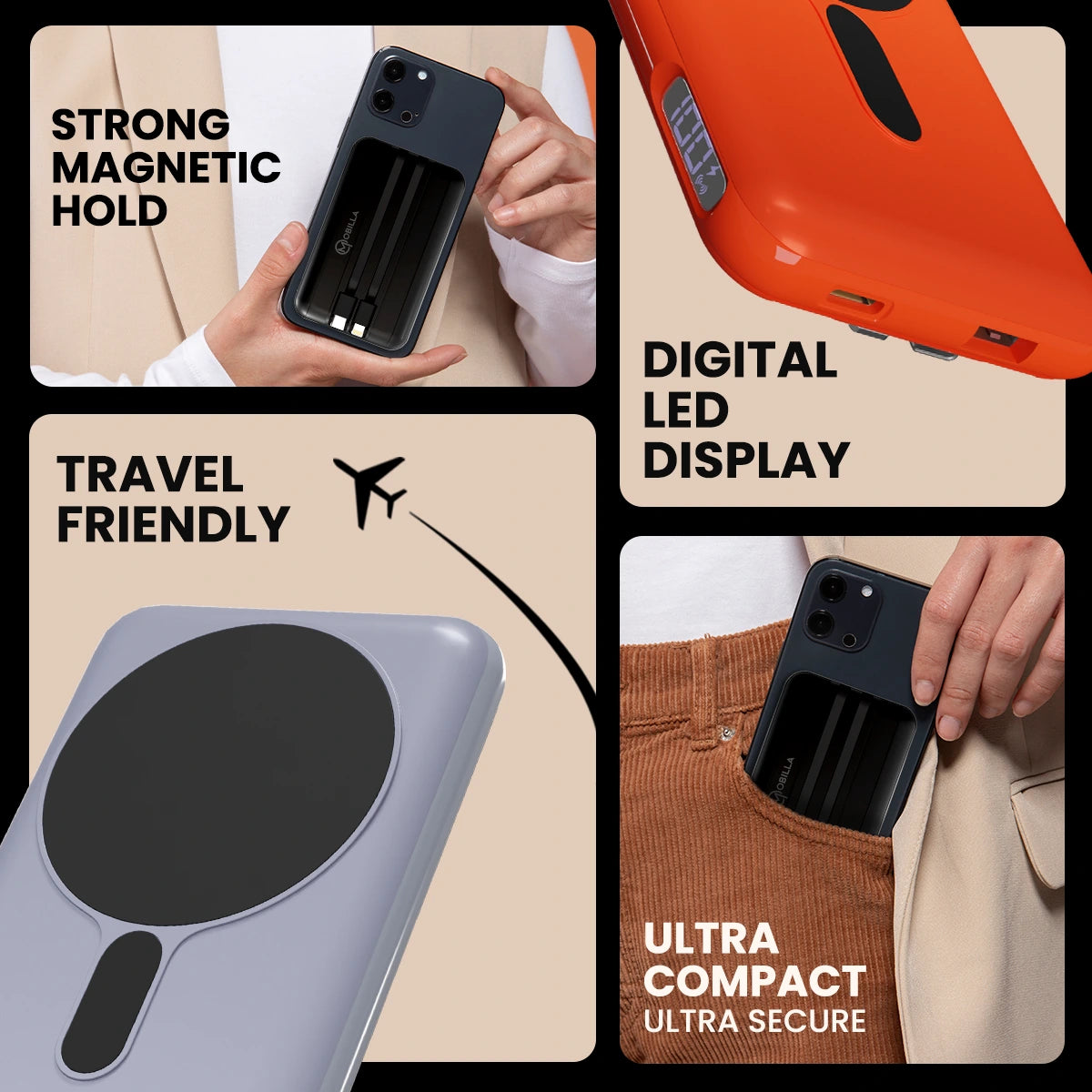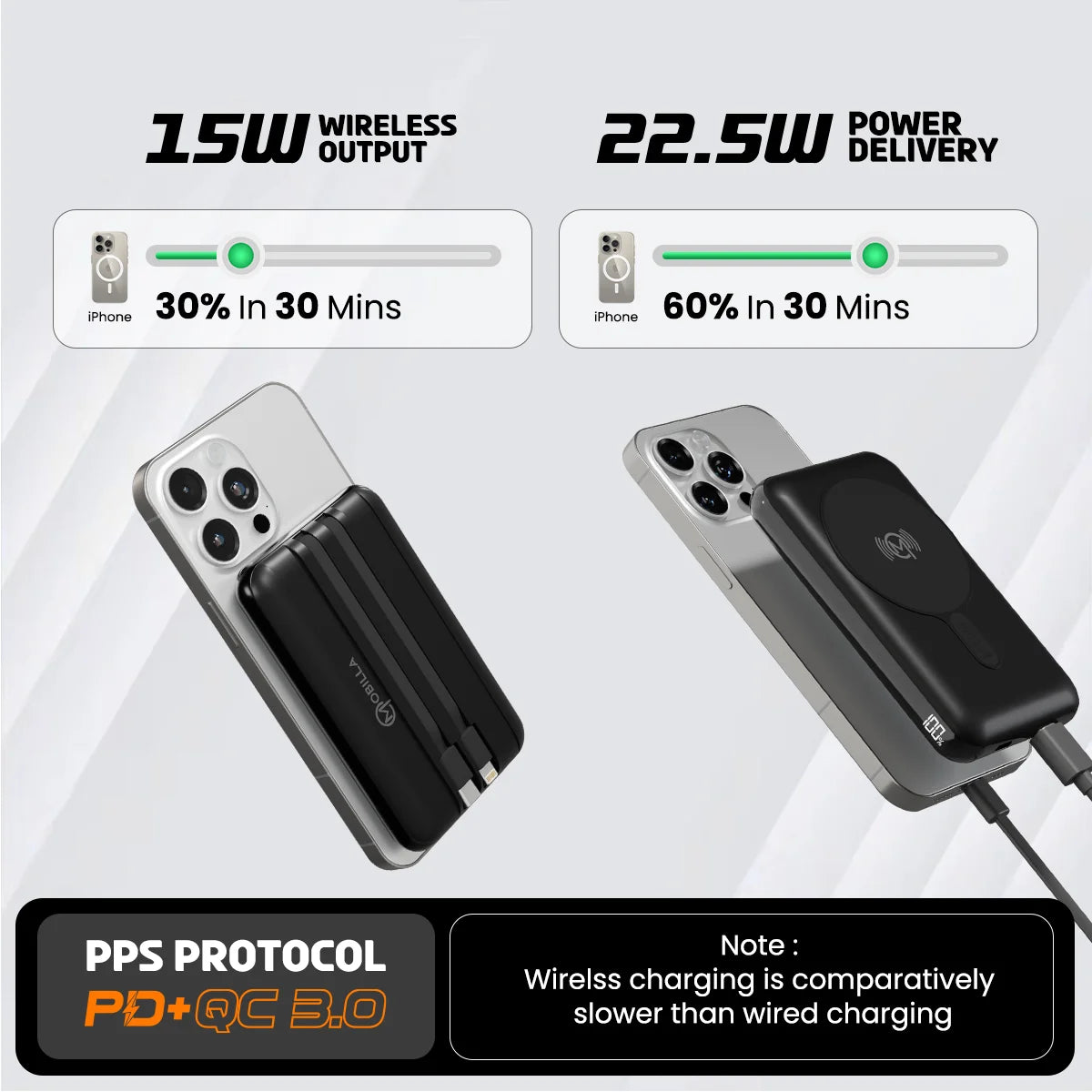 Mag Safe Wireless Charging | 22.5W Power Delivery | 15W Wireless Output | PD+QC 3.0 | Battery Capacity 10000mAh | Multi-Layered Protection | Strong Magnetic Hold | Stylish & Compact Design | In-Built Type C & Lightning Cable