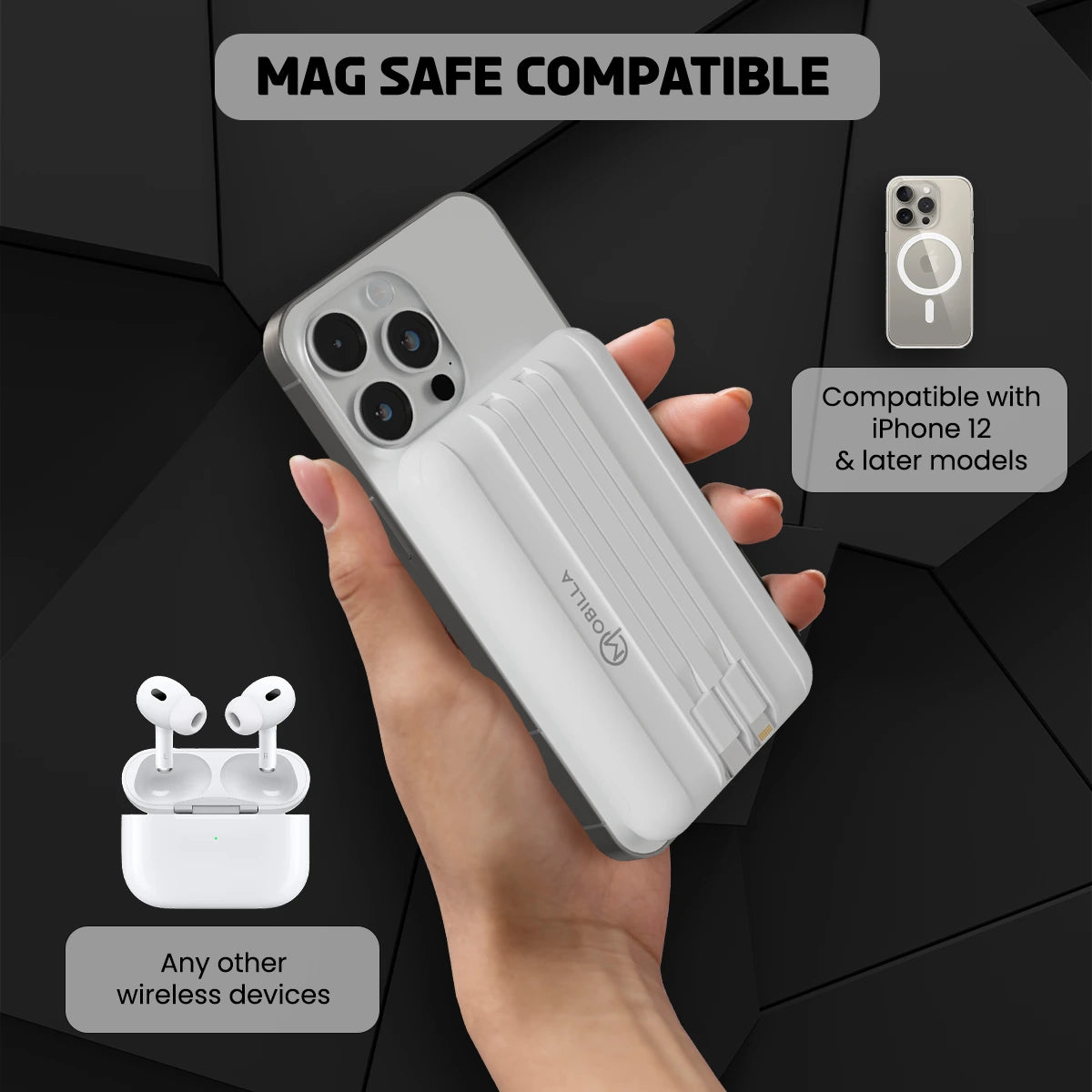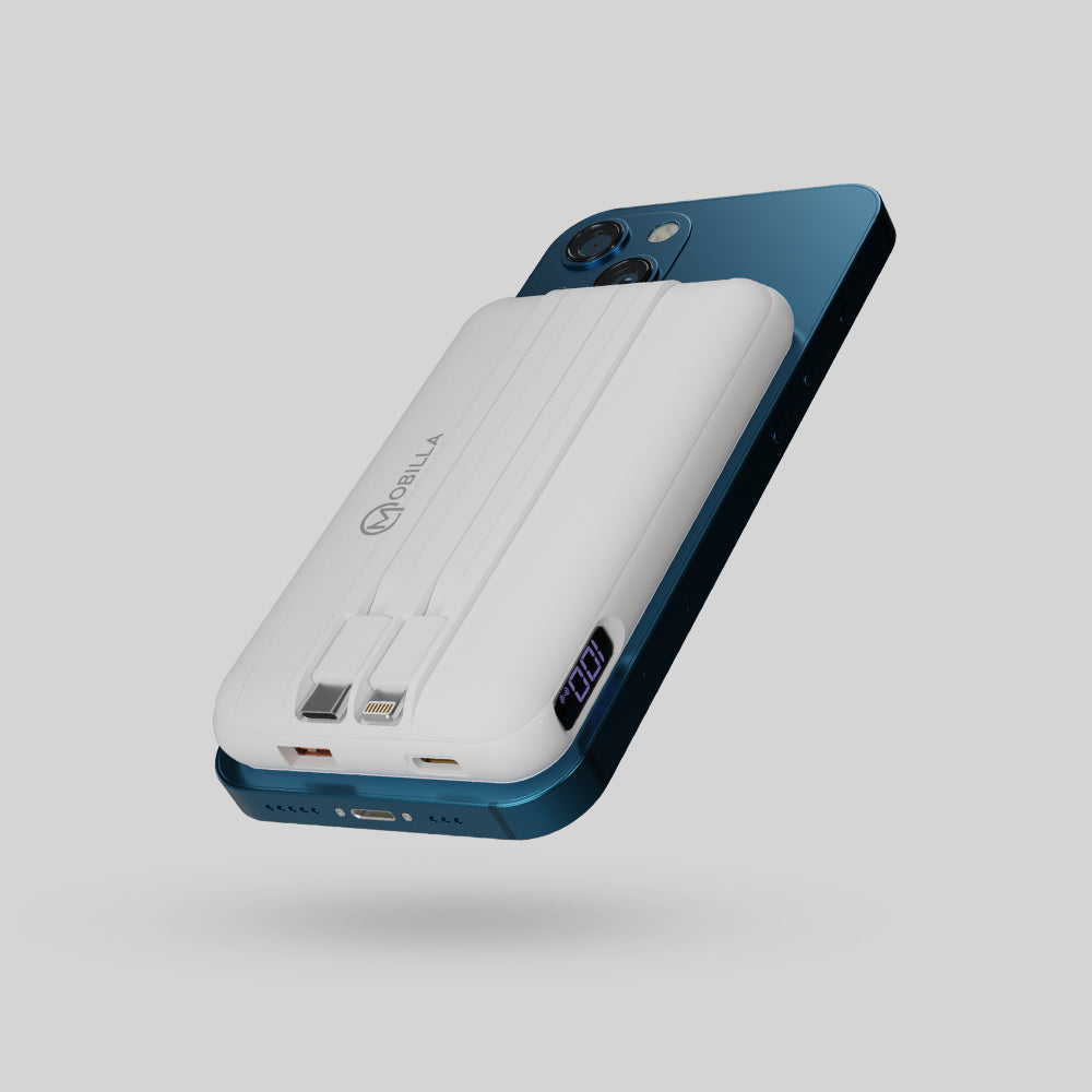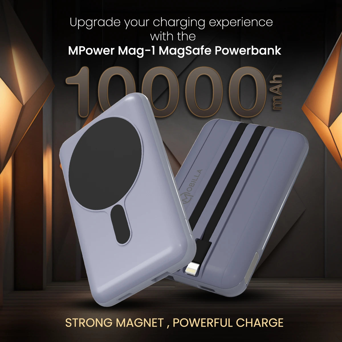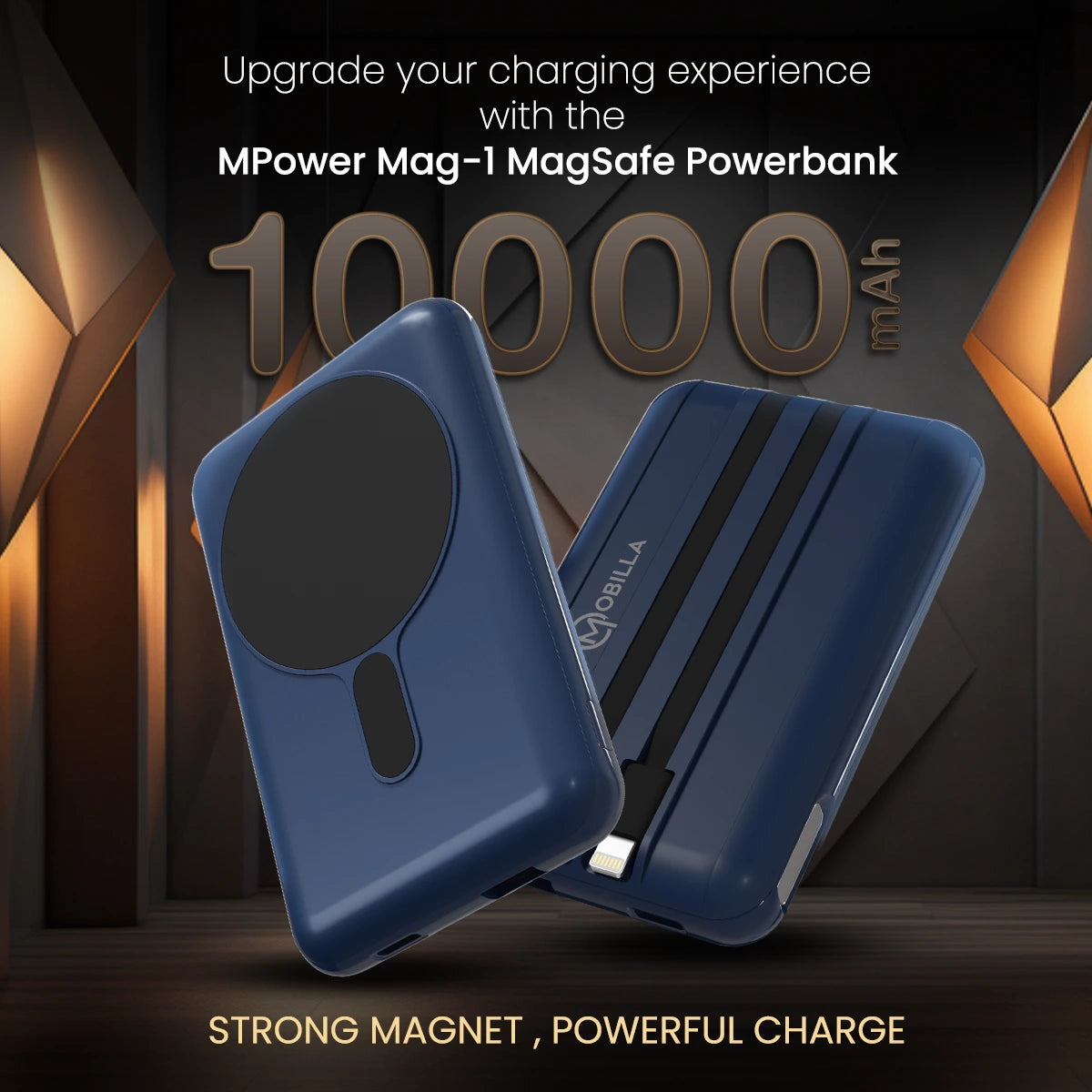 Experience the next level of charging with the Mobilla MPower Mag-1, a wireless power bank designed for seamless convenience. Featuring MagSafe wireless charging and strong magnetic hold, it effortlessly powers up your devices with 15W wireless output and 22.5W Power Delivery for blazing-fast charging. With a 10000mAh battery capacity, this portable power bank ensures your devices stay charged all day. The PD + QC 3.0 technology guarantees efficient power transfer, while the multi-layered protection keeps your devices safe. Equipped with in-built Type-C and Lightning cables, it offers unmatched versatility for all your charging needs. Designed with a stylish matte finish and a compact build, the MPower Mag-1 is easy to carry, making it the best power bank for mobile users on the go. The LED battery indicator keeps you updated on power levels, so you’re never caught off guard. Whether you're looking for the best power bank in India, a wireless charging power bank for iPhone, or a fast charging power bank, the MPower Mag-1 delivers power, style, and performance in one sleek package. Stay charged, stay ahead!