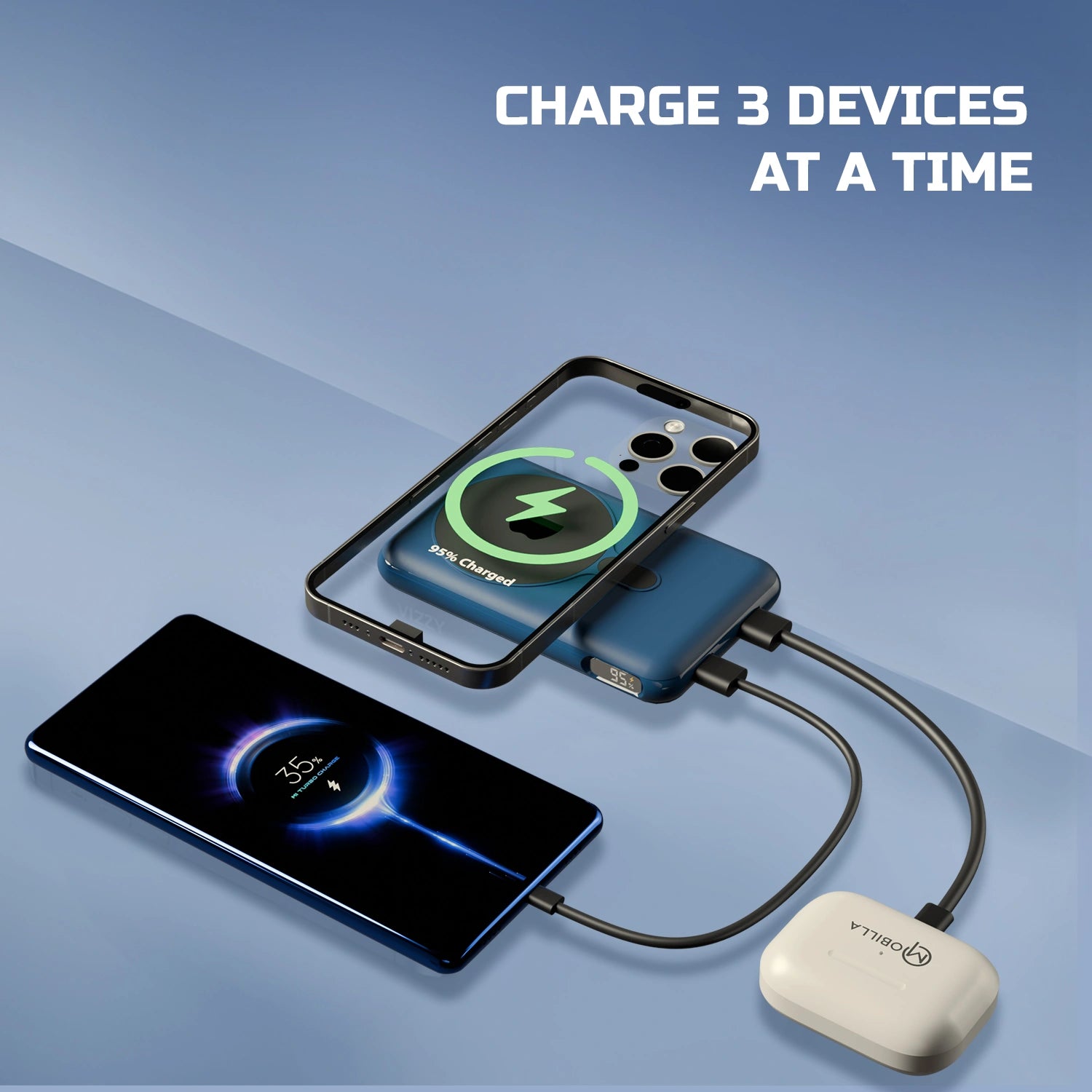 You can charge 3 devices at the same time: 2 via USB-A & Type-C Port and 1 wirelessly.