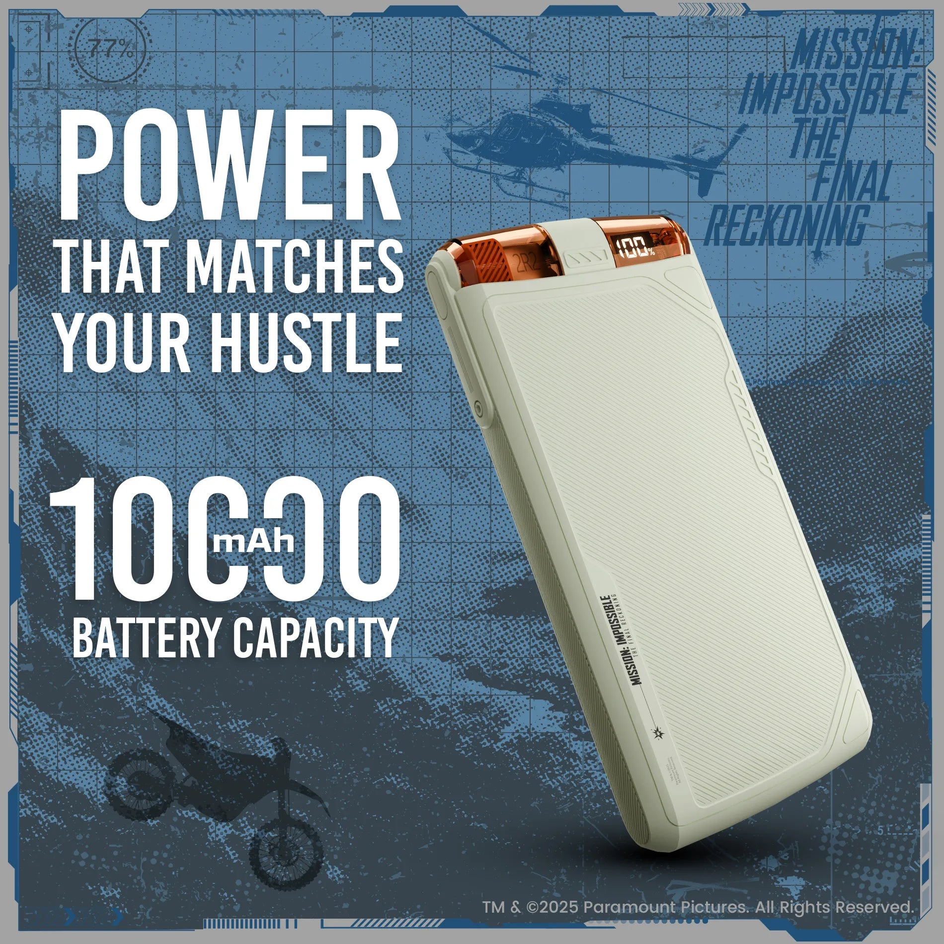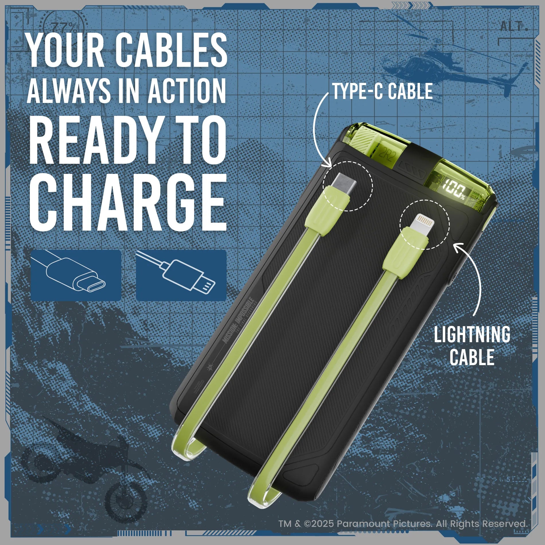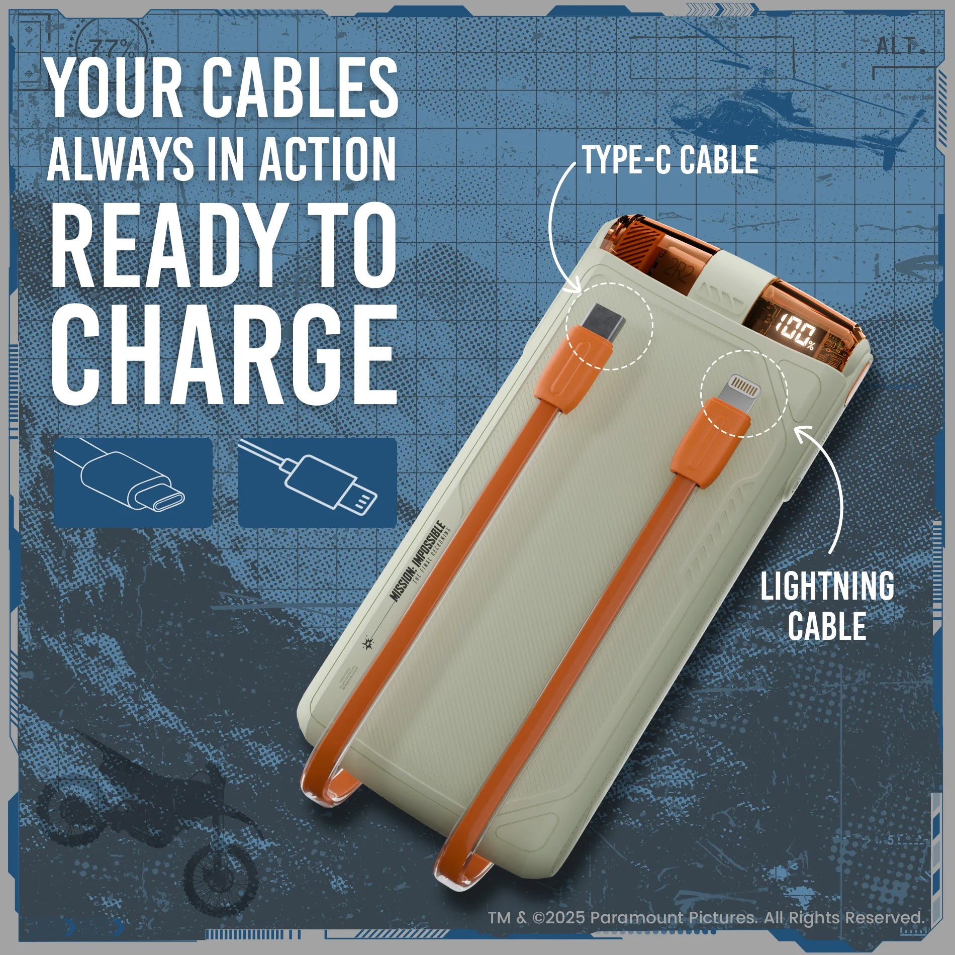 Power meets style with the MPower X7, a 10000mAh power bank built for those who need speed and reliability on the go. Designed with a sleek profile, this compact power bank delivers a powerful 22.5 watt power bank output using PD+QC 3.0 technology, ensuring devices are charged quickly and efficiently. Its integrated Type C and lightning cable power bank setup eliminates the need for extra wires, while the smart 4-in-1 charging power bank functionality lets you power up four devices at once. Whether it's a smartphone, tablet, or earbuds, this fast charging power bank handles it all with ease. The digital display indicator keeps you informed, and multi-layered protection ensures safe charging. It's also flight friendly, making it perfect for travelers. Part of the Mission Impossible Edition, it’s crafted for those who expect more from their gear—a true premium power bank experience.