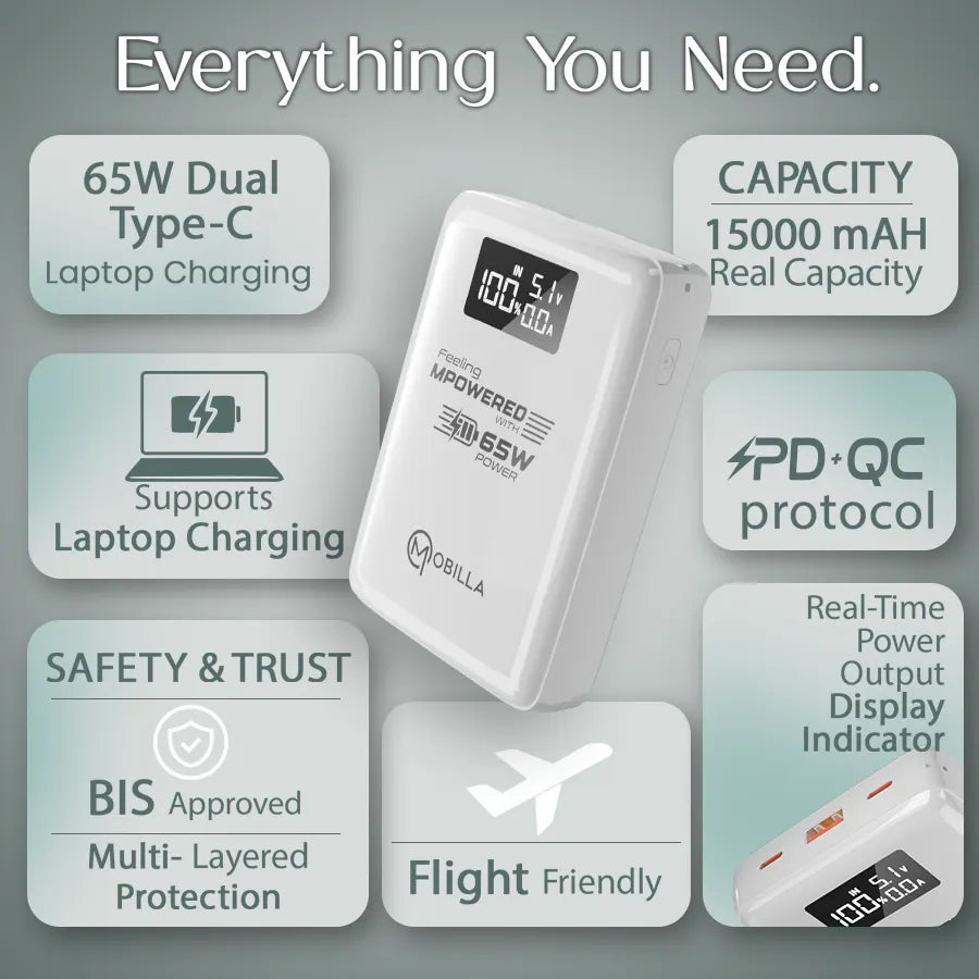 65W Fast Charging | 15000 ReALmAH Battery Capacity | Dual Type-C Ports | USB-A Output | Quick Charge Input | LED Power Display | BIS Approved