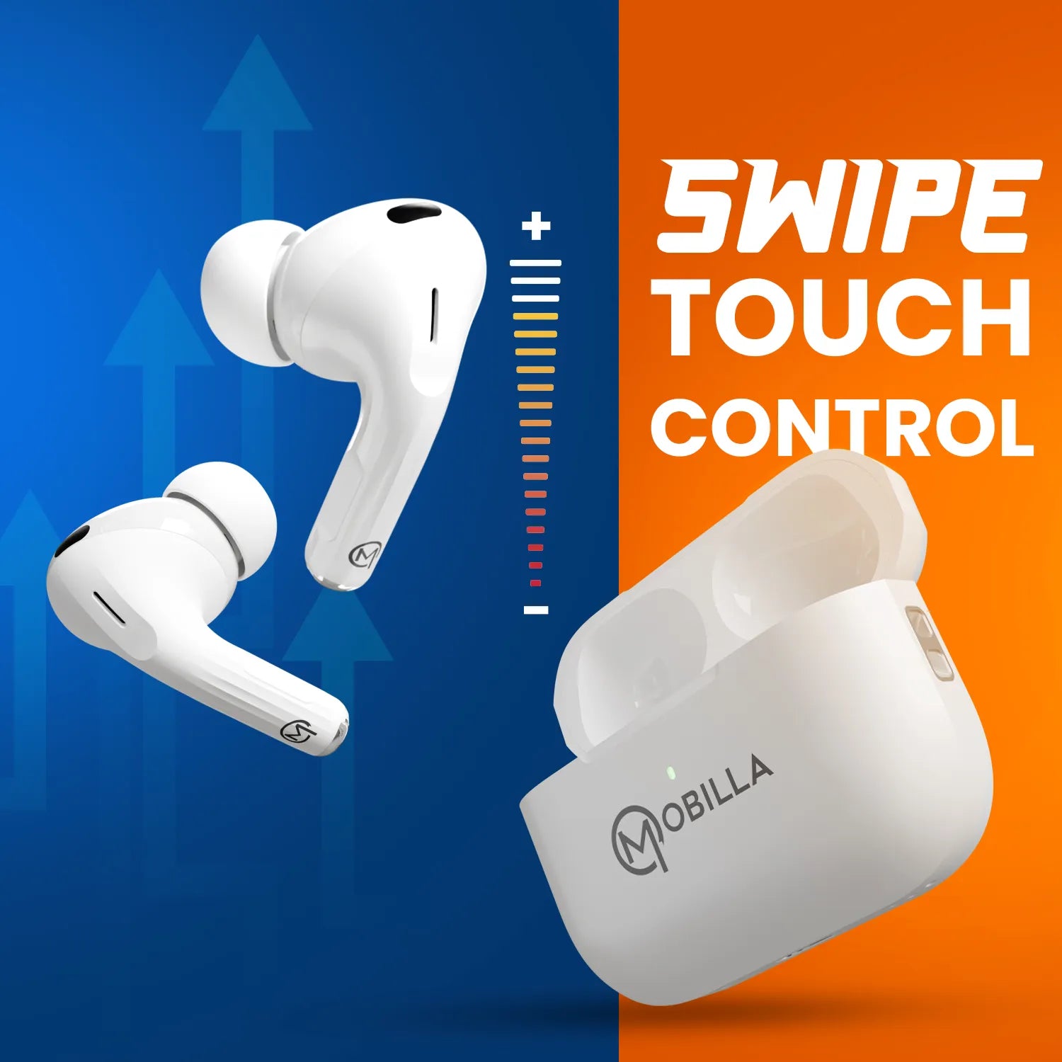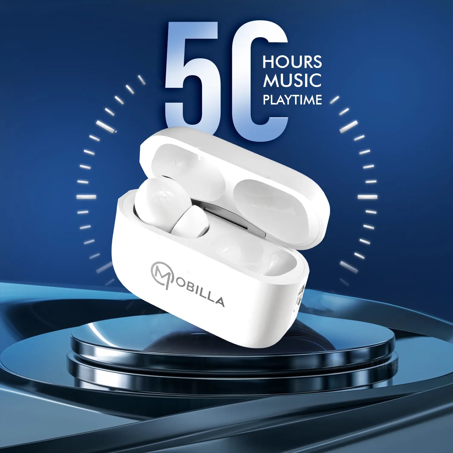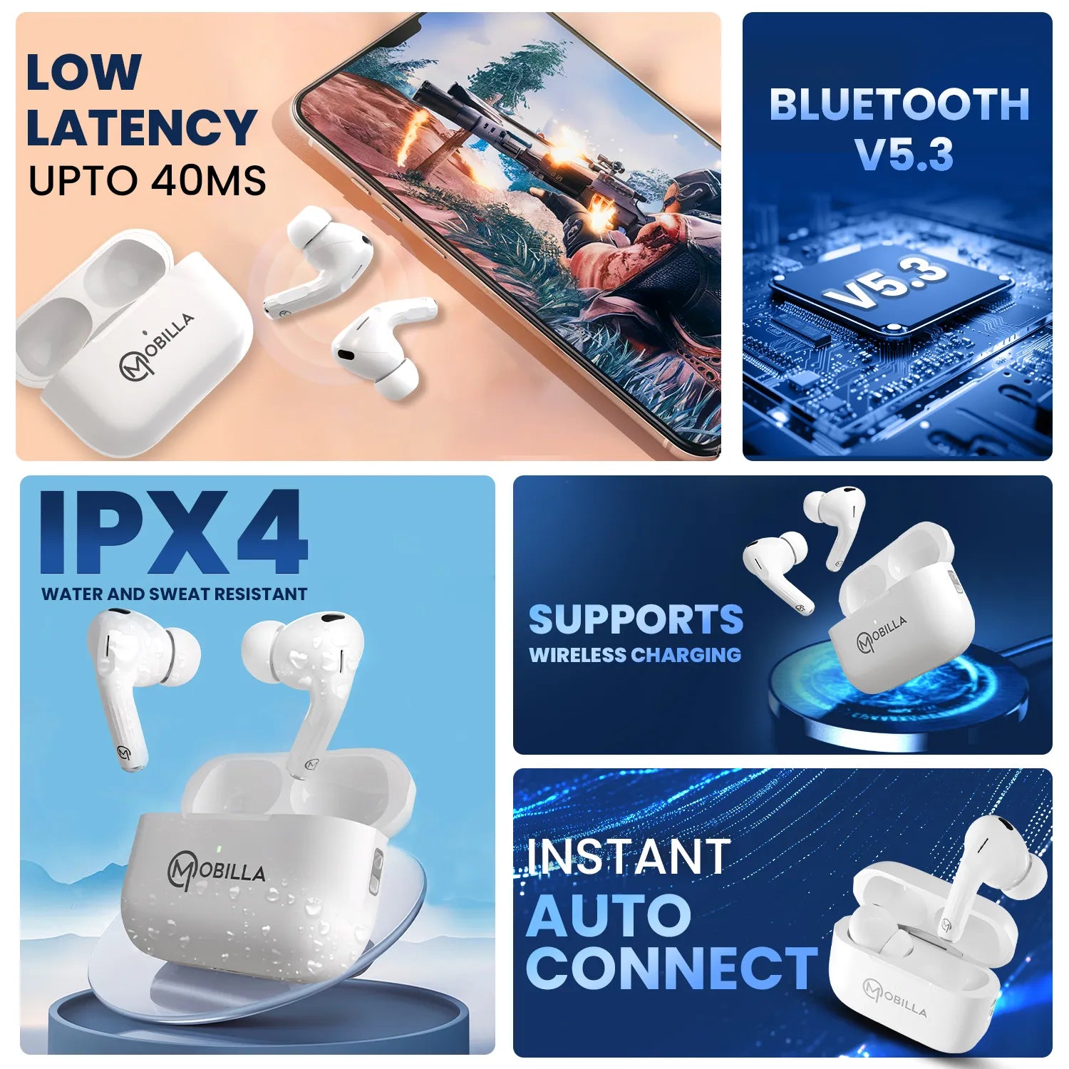Discover the perfect blend of style, performance, and convenience with Mobilla MBuds 533 – the TWS earbuds that elevate every moment! With music playtime up to 50 hours, these true wireless earbuds are designed to keep you immersed in your favourite tunes all day long. Experience crystal clear calls with 4 mics with AI-ENC technology that reduces background noise, making them the best earbuds for calls and music. Thanks to instant auto-connect, you're instantly connected to your devices, while swipe touch controls make managing your music and calls easier than ever. Plus, with plug-in to play/plug-out to pause functionality, your music starts and stops automatically. Designed for your active lifestyle, the MBuds 533 are IPX4 water and sweat-resistant and feature a low latency of up to 40ms for a lag-free gaming experience. The quick charging capability offers 120 minutes of playtime with just a 15-minute charge, and with support for wireless charging, you can charge with ease, anytime, anywhere. Crafted with the latest Bluetooth Version 5.3 and a Type-C charging interface, these in-ear earbuds ensure a seamless connection and fast, reliable charging. If you're looking to buy earbuds online that offer the ultimate combination of convenience, quality, and advanced technology, look no further than the MBuds 533 – the perfect choice for earbuds online shopping!