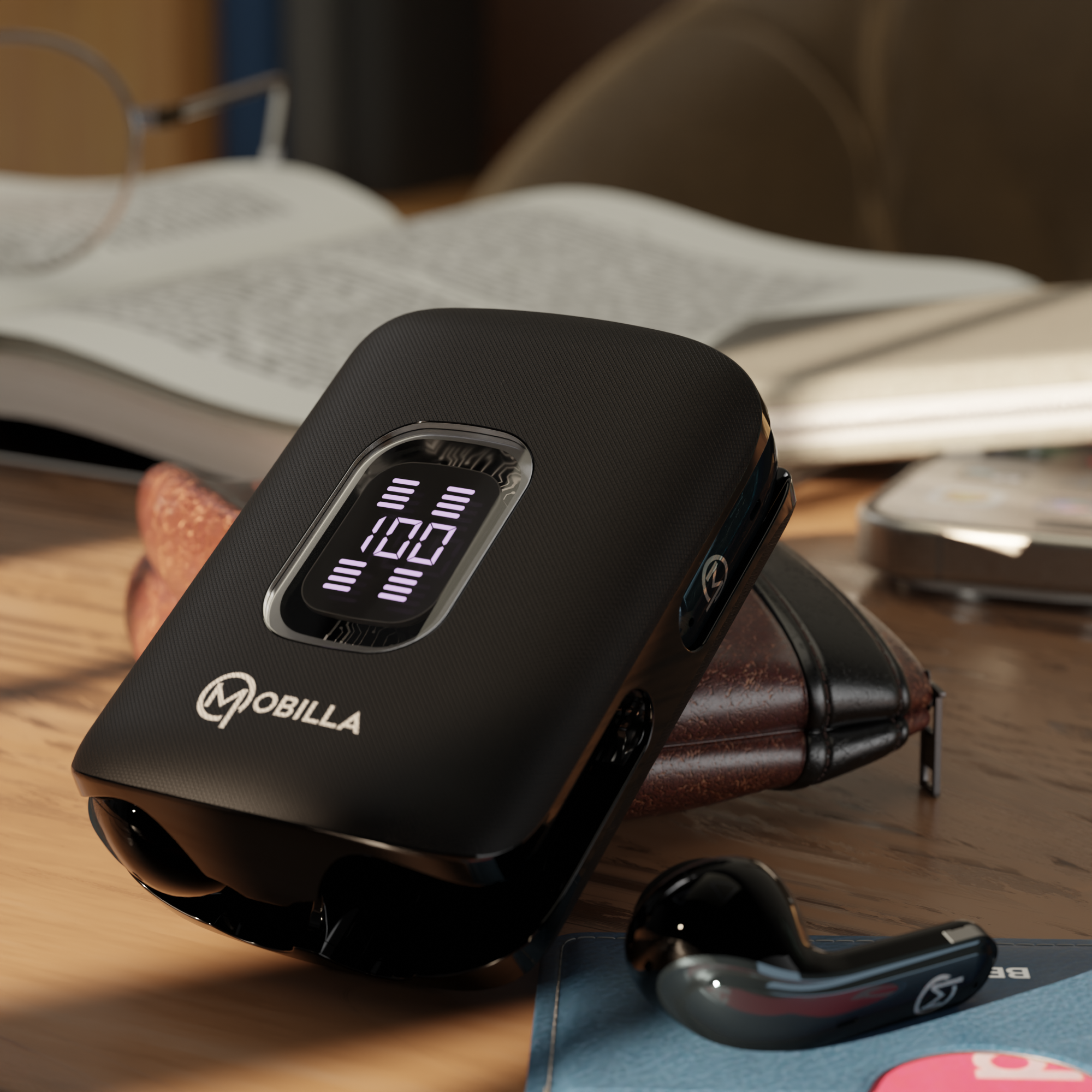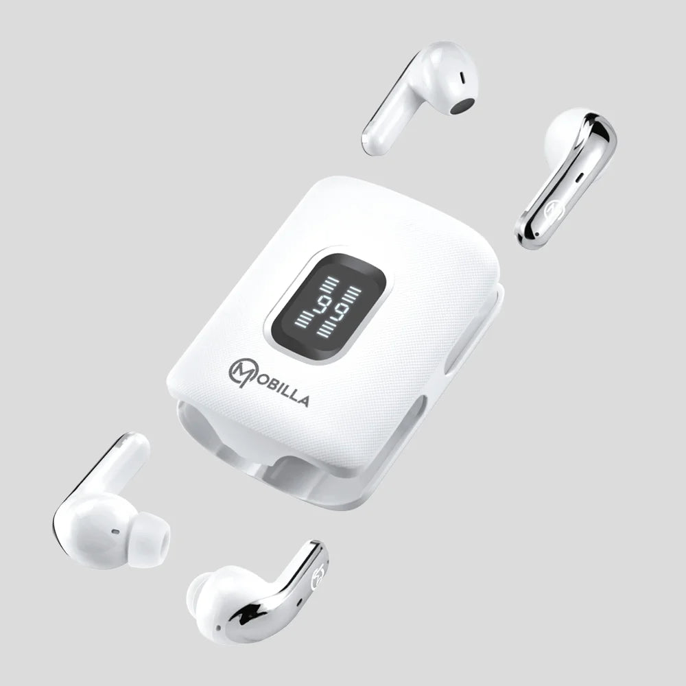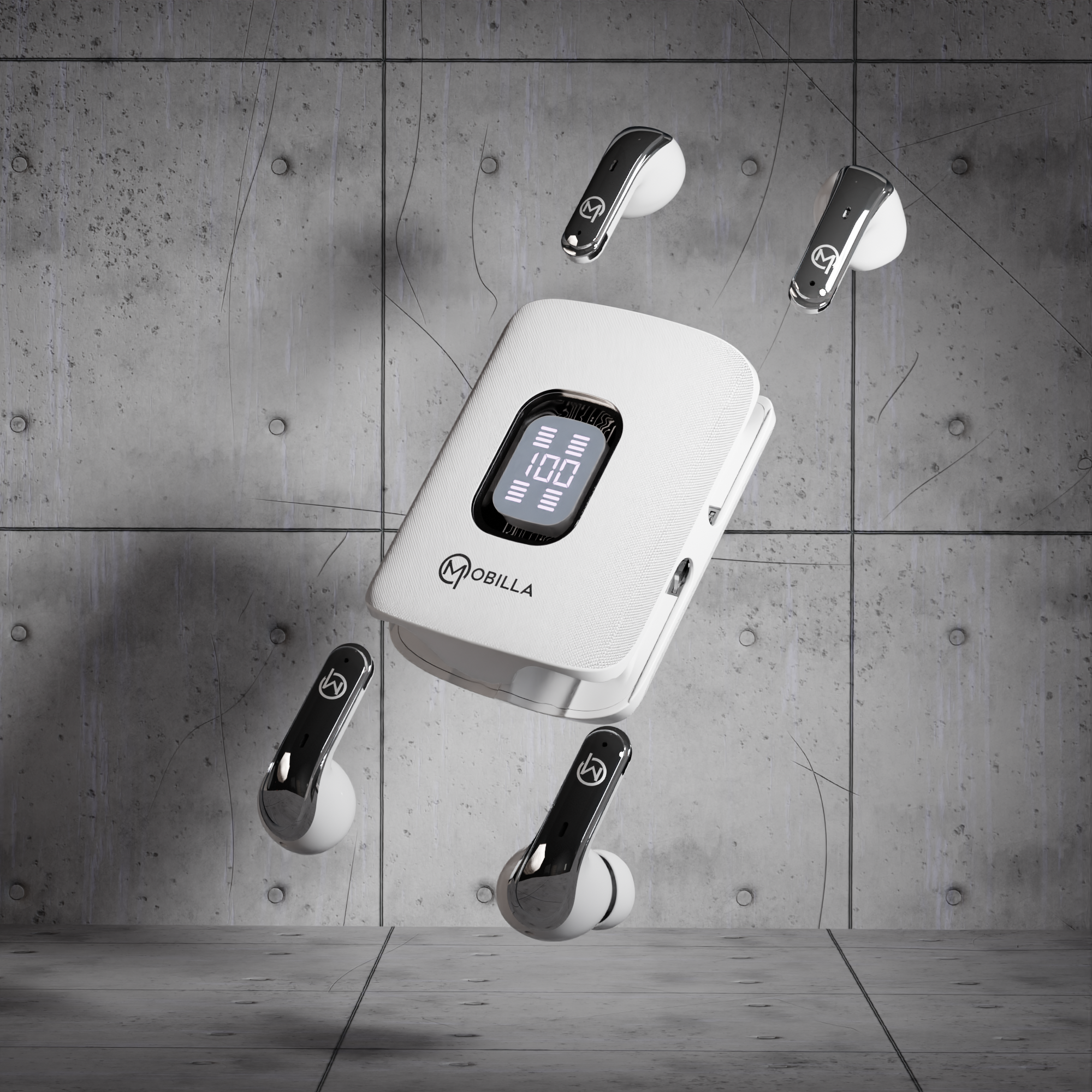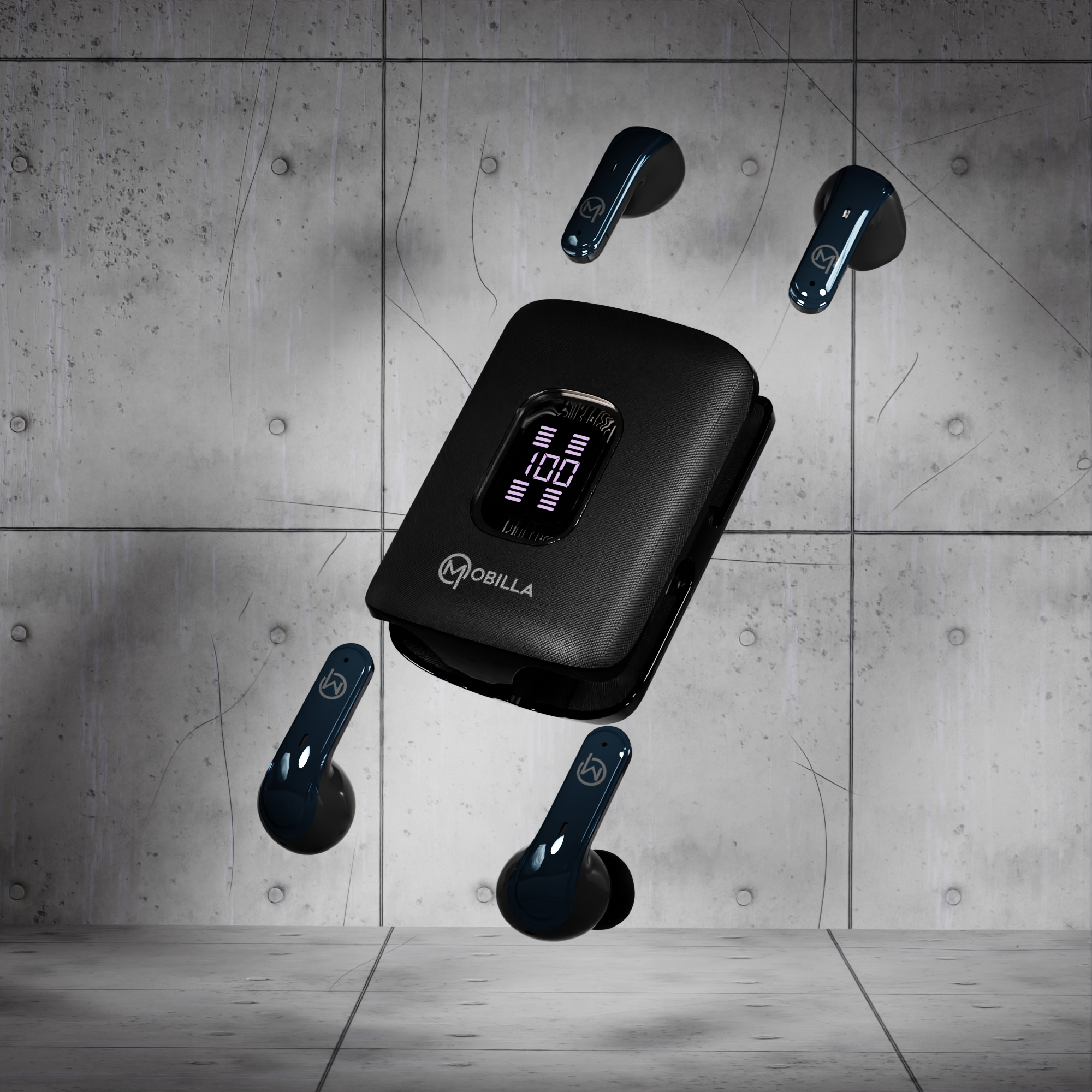 Introducing the Mobilla MBuds Dual – the revolutionary TWS earbuds that bring unparalleled convenience with 2 pairs of earbuds in 1 charging case. Perfect for sharing or enjoying dual connectivity, these true wireless earbuds offer 75 hours of music playtime, ensuring non-stop entertainment for you and a friend. With the innovative dual-sharing TWS earbuds feature, you can connect both pairs of earbuds to a single device or use them independently with separate devices for individual connectivity. This versatility means you can enjoy seamless audio and crystal clear calls with the advanced AI-ENC quad mic in any scenario. The ANC up to 32dB provides effective noise cancellation, allowing you to immerse yourself in your music without distractions. The dedicated Bass & Theatre mode enhances your listening experience with tailored sound profiles, whether you're watching movies or enjoying deep bass. Designed with intuitive touch controls, the MBuds Dual offers effortless management of your audio, while instant auto connect ensures a hassle-free pairing process. Built to withstand your active lifestyle, these in-ear earbuds are IPX5 water resistant, so you can use them in any weather or during intense workouts. Looking to buy earbuds online? The Mobilla MBuds Dual is your ideal choice for earbuds online shopping, combining wireless Bluetooth technology with the practicality of 2 pairs of earbuds in one case. Elevate your audio experience and enjoy the ultimate flexibility and performance with these true wireless earbuds!